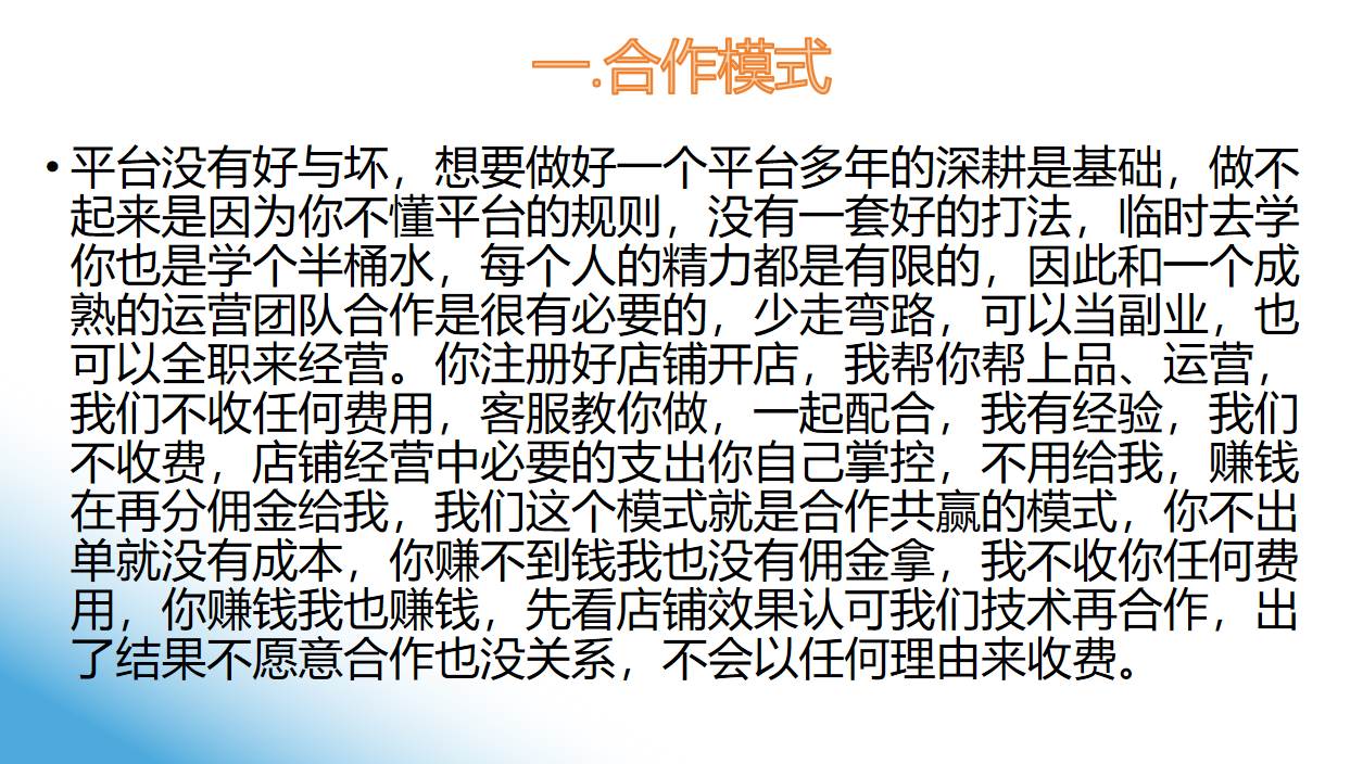 小白福利,不用担心不会做,我们老运营代替你做,简单来说,你开店,我做代运营,你做甩手掌柜。你赚钱后提现到账的利润我抽2%。新店开始第一天日出20单、第二天100单左右、第三天200单左右。最少单日收入4K+以上。刷新你的认知,过时的只有思维、玩法、技术,没有过时的平台,赚钱的永远是少部分人,目前只招收前100名合作伙伴,公司老运营人选数量有限,想吃螃蟹的别犹豫,不要你的钱,一起赚市场的钱。0成本尝试。无风险。